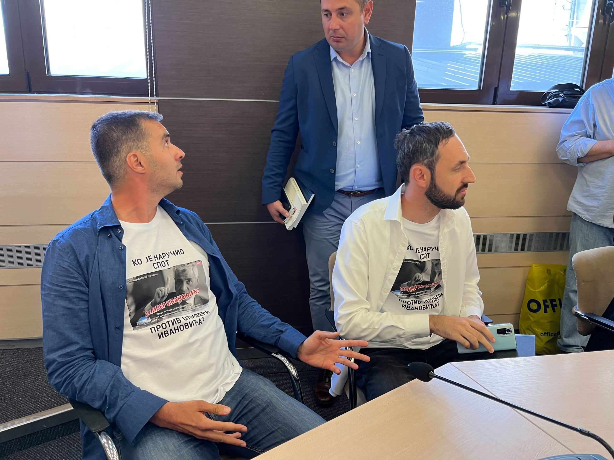 U prostorijama REM-a je i Savo Manojlović, zahvaljujući akreditaciji radija Goraždevac sa Kosova, i to u majici sa likom Olivera Ivanovića i natpisom „Ko je naručio spot protiv Olivera Ivanovića?“, prenosi N1.