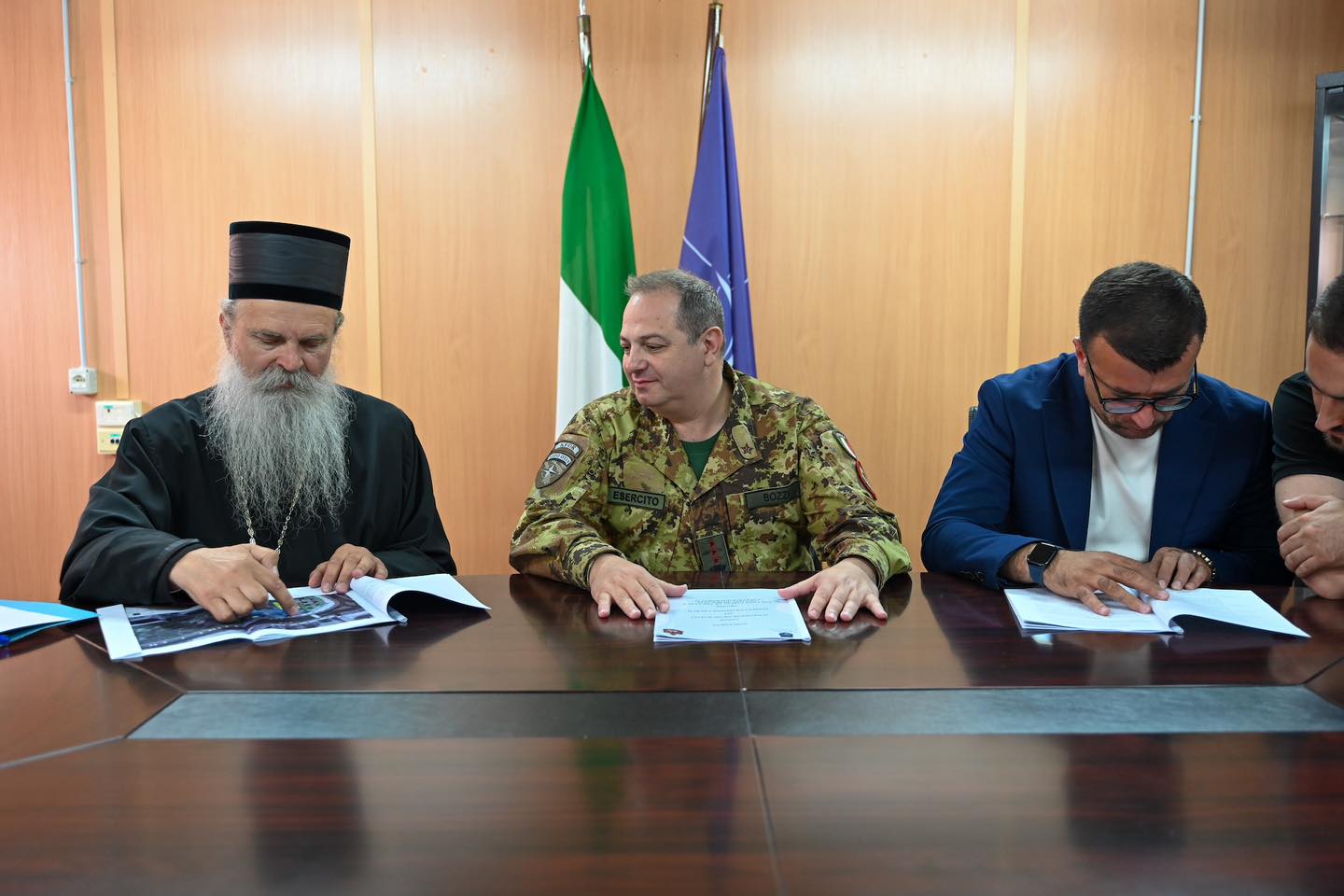 „Regionalna komanda KFOR-a Zapad, posredovala je sastanku episkopa pravoslavne crkve Teodosija Šibalića i predsednika opštine Istok Iljira Feratija, kako bi potpisali važan sporazum između dve strane u vezi sa preuređenjem urbanog područja, uključujući igralište za decu opštine“, piše na Fejsbuk objavi KFOR-a.