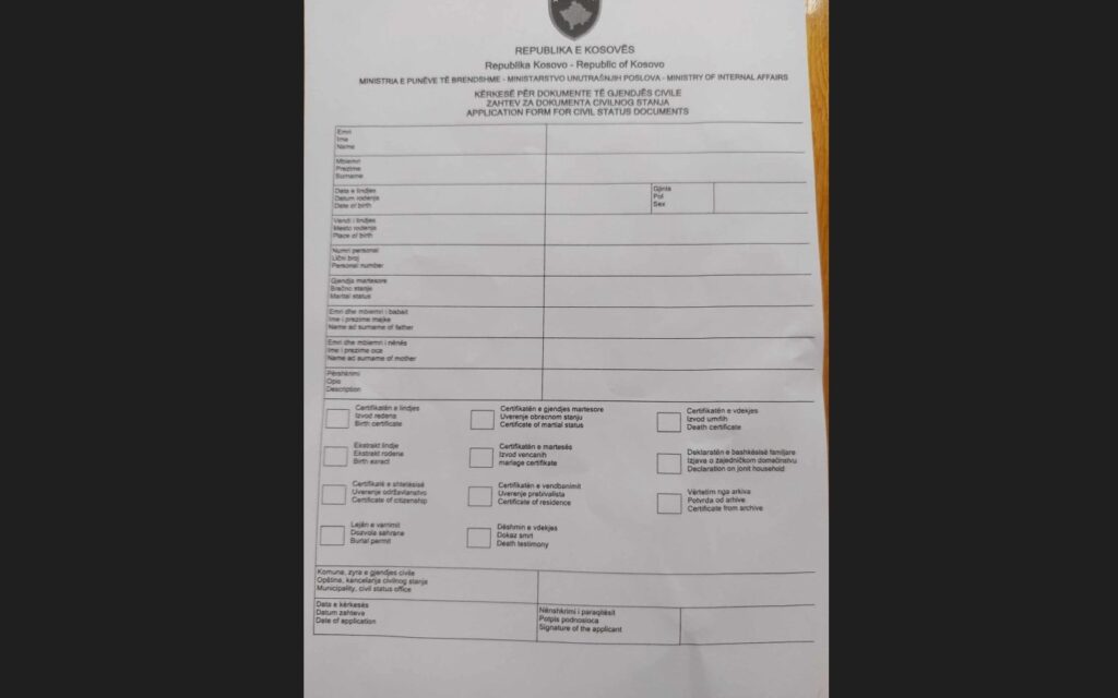 Takođe u delu formulara gde treba da se upiše ime i prezime jednog od roditelja podnosioca zahteva na srpskom jeziku piše “ime i prezime majke”, dok u istoj koloni na albanskom i engleskom piše “ime i prezime oca”. U sledećoj koloni na albanskom i engleskom piše ime i prezime majke, a na srpskom “ime i prezime oca”.