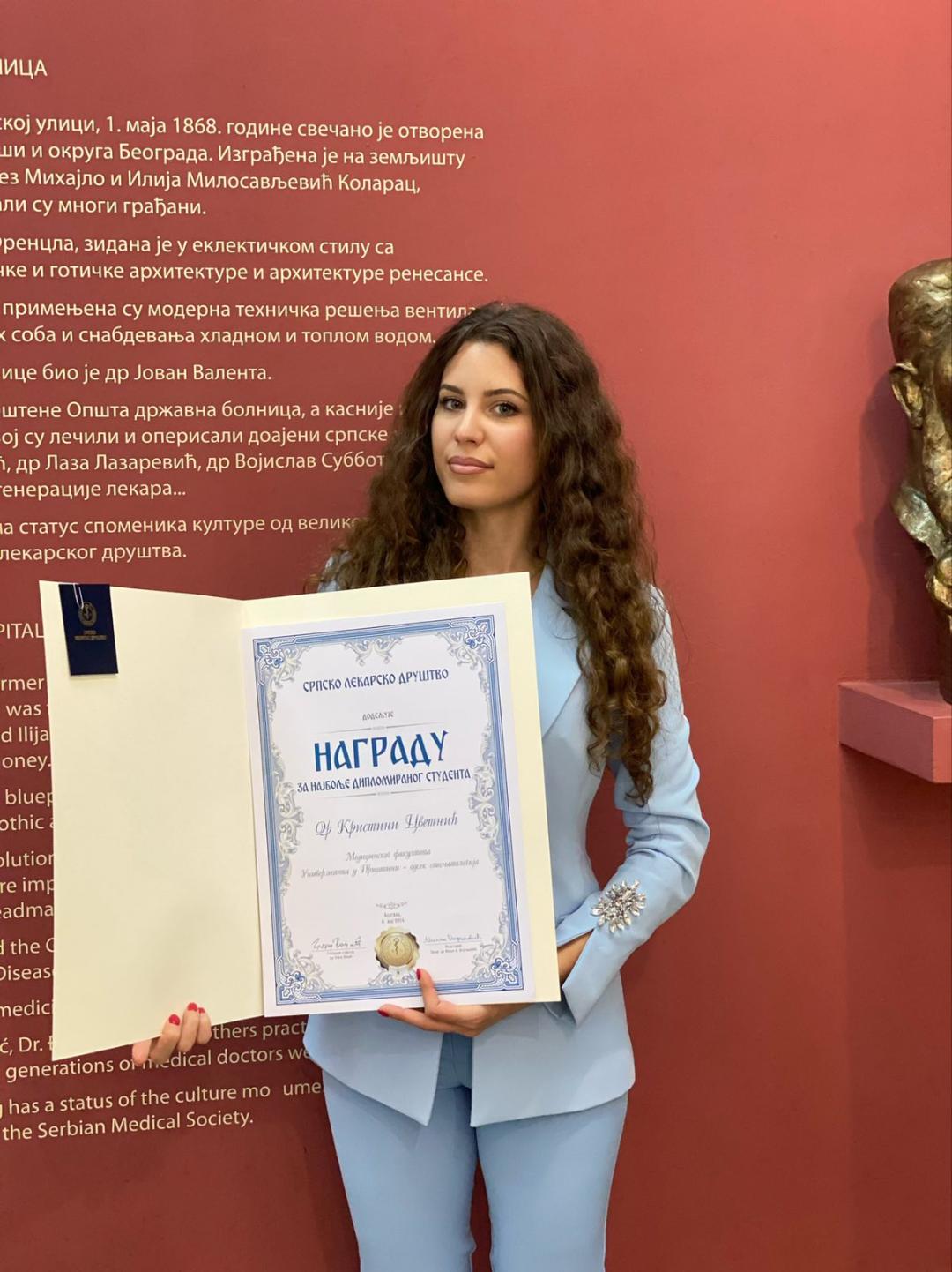 Nagradu za najbolje diplomiranog studenta u 2023. godini dobila je dr Kristina Cvetnić sa Medicinskog fakulteta Univerziteta u Prištini sa sedištem u Kosovskoj Mitrovici – odsek stomatologija.