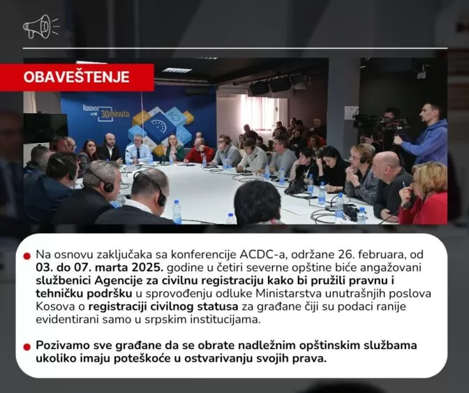 Prema rečima Bljerima Camaja, generalnog direktora Agencije za civilnu registraciju, službenici ACR-a biće angažovani od 3. do 7. marta kako bi pomogli opštinskim administracijama u sprovođenju odluke Kosovskog ministarstva unutrašnjih poslova br. 02616.