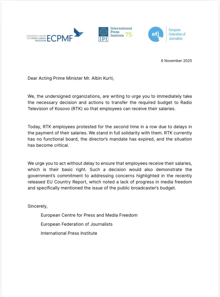 Evropski centar za slobodu štampe i medija (ECPMF), Međunarodni institut za štampu (IPI) i Evropska federacija novinara (EFJ) pozvali su danas vršioca dužnosti premijera Kosova, Aljbina Kurtija, da hitno reaguje i obezbedi isplatu zaostalih plata zaposlenima u Radio-televiziji Kosova (RTK).